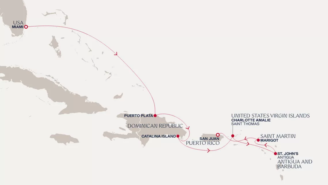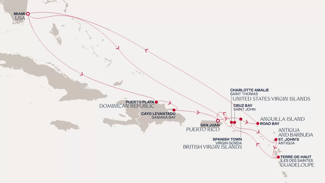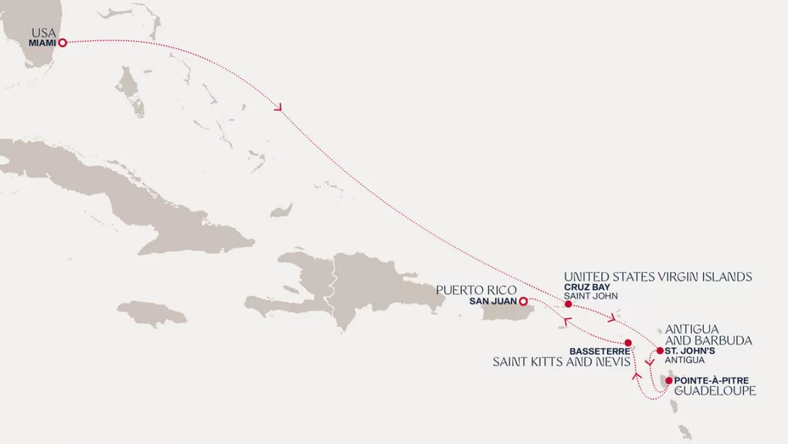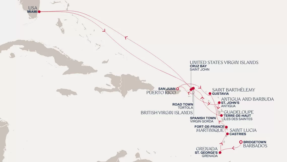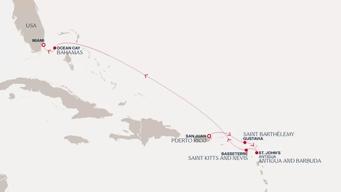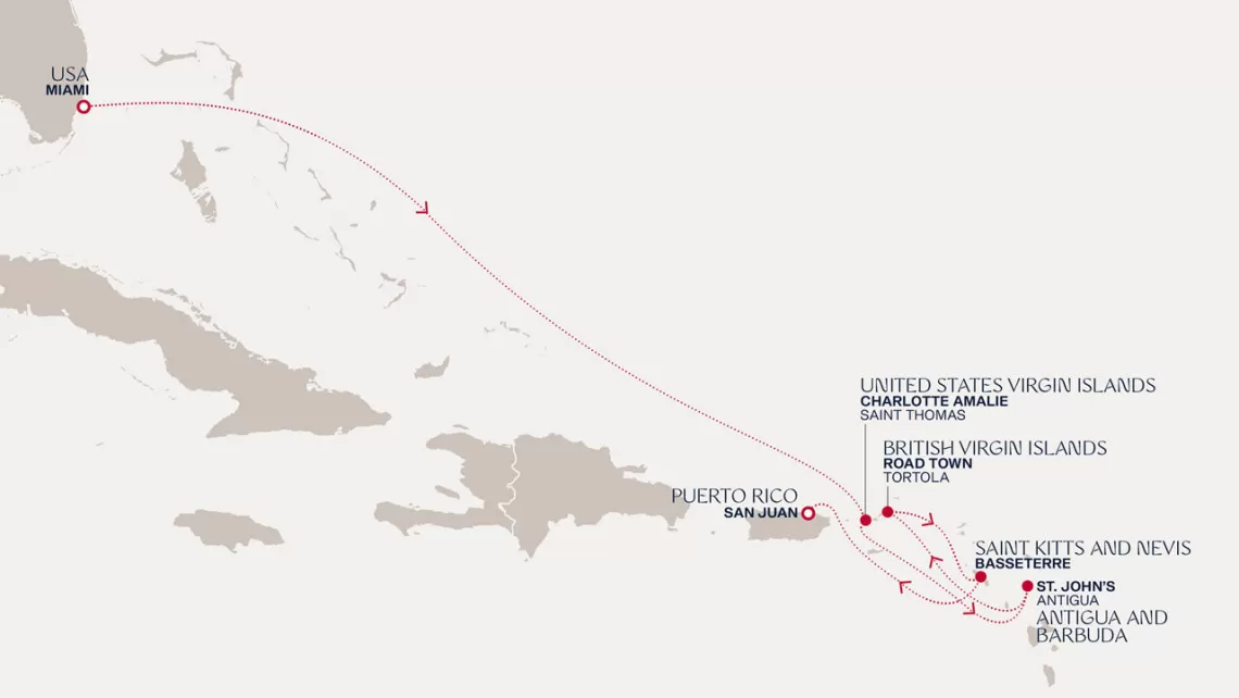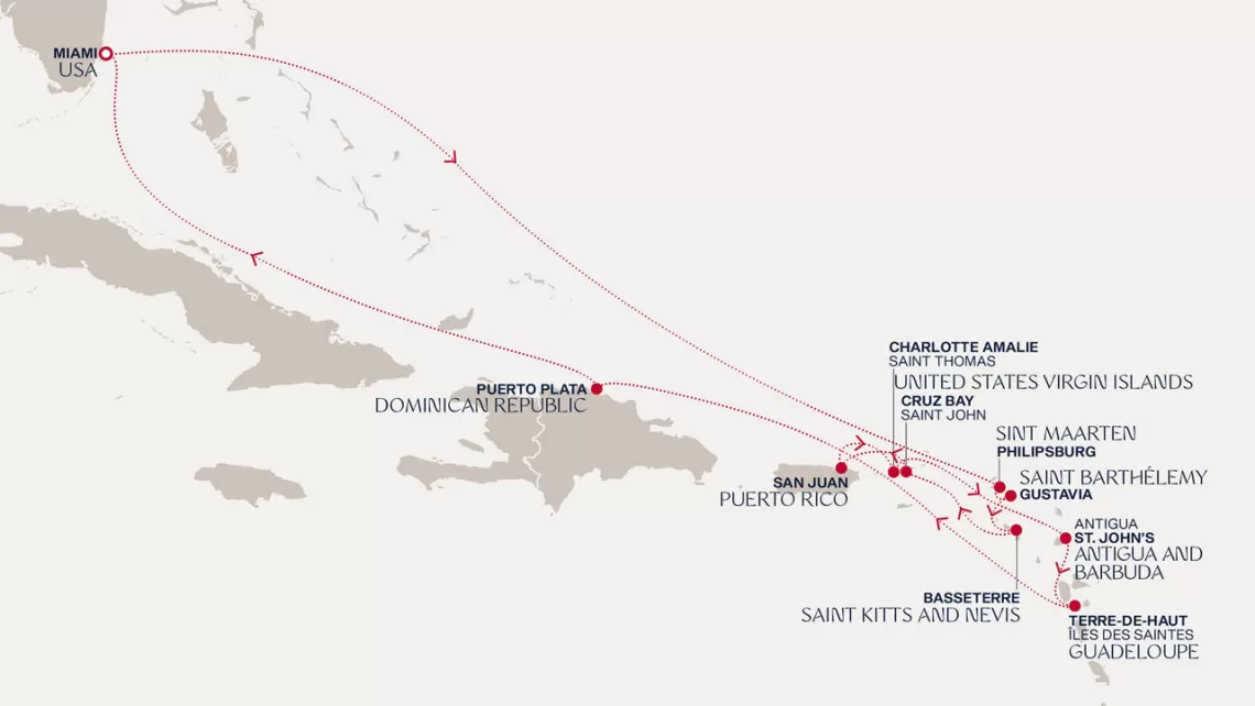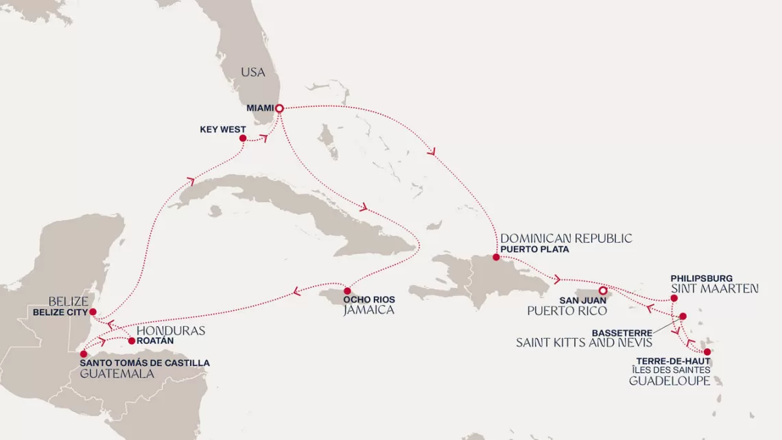 Маршрут круиза: Бриджтаун, о. Барбадос - Фор-де-Франс, о. Мартиника - Бастер, о. Сент-Китс - Сан-Хуан - Род-Таун, о. Тортола - Сент-Джонс, о.Антигуа - Густавия, о. Сен-Бартельми - Роуд Бэй, о. Ангилья - море - море - Майами - море - море - Ла-Романа - Сан-Хуан - Бастер, о. Сент-Китс - Ле Труа-Иле, о. Мартиника - о. Бекия - Кингстаун, о. Сент-Винсент - Бриджтаун, о. Барбадос