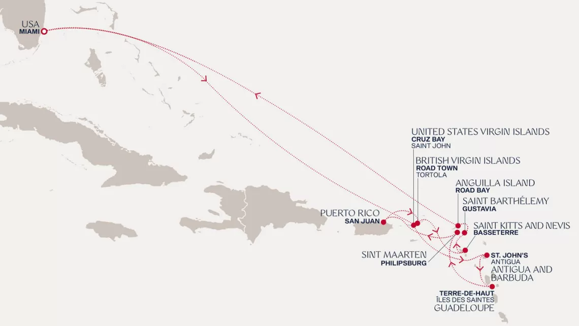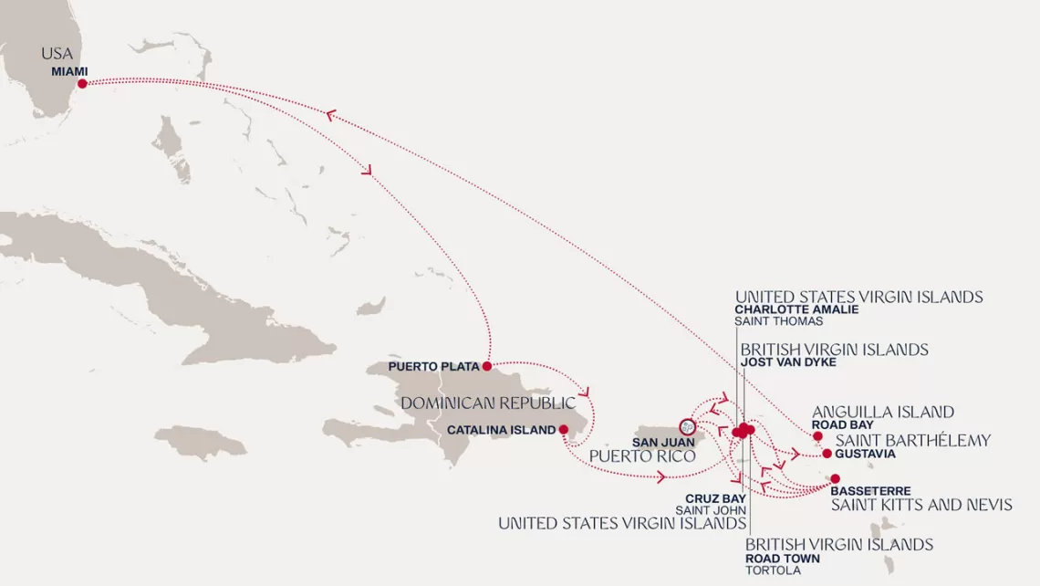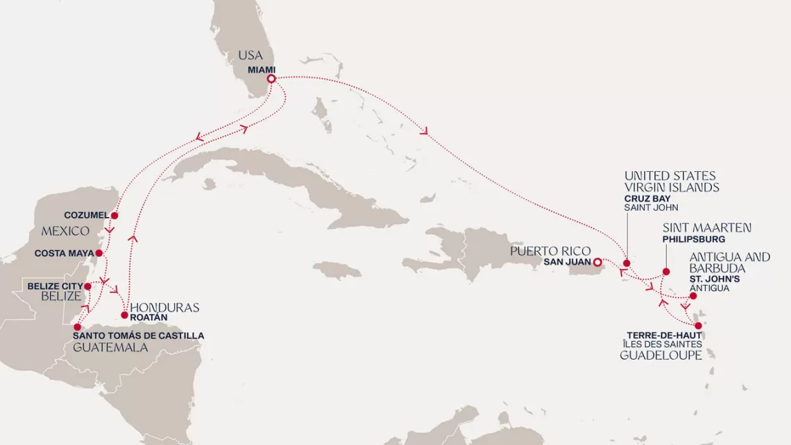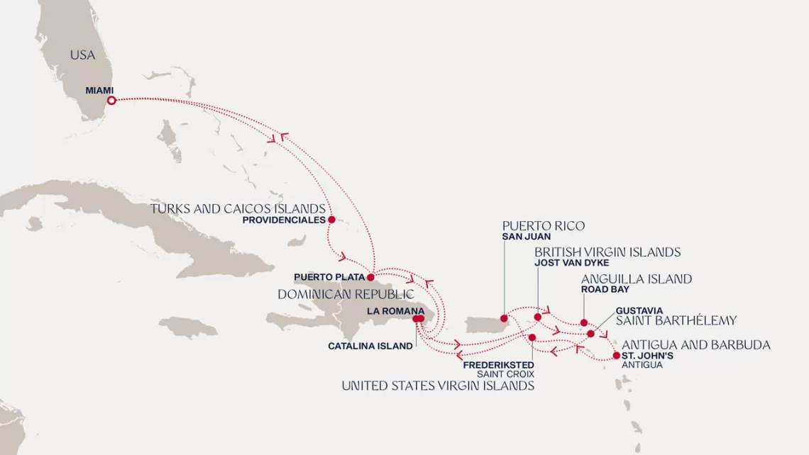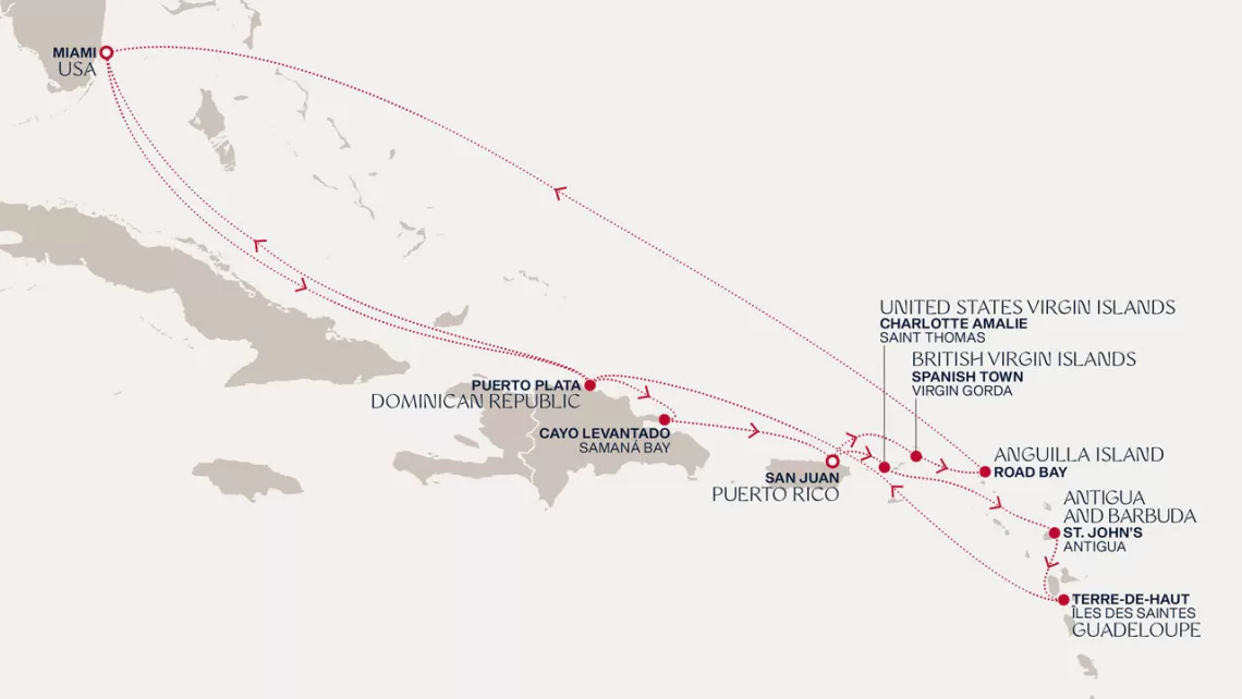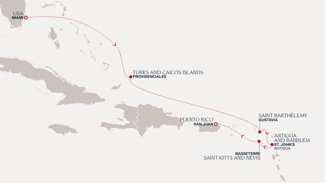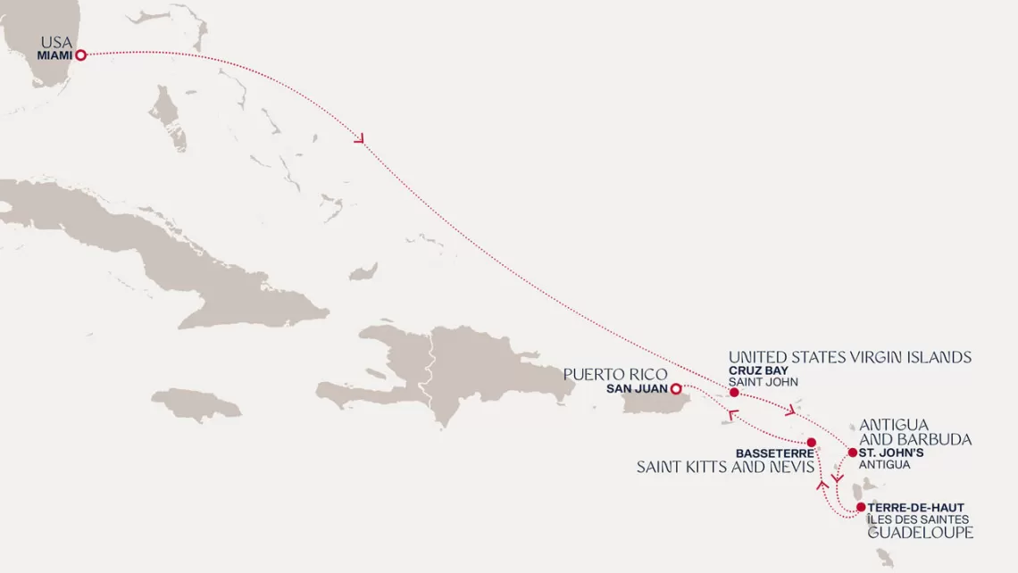 Маршрут круиза: Бриджтаун, о. Барбадос - Фор-де-Франс, о. Мартиника - Бастер, о. Сент-Китс - Сан-Хуан - Род-Таун, о. Тортола - Сент-Джонс, о.Антигуа - Густавия, о. Сен-Бартельми - Роуд Бэй, о. Ангилья - море - море - Майами - море - море - Ла-Романа - Сан-Хуан - Бастер, о. Сент-Китс - Ле Труа-Иле, о. Мартиника - о. Бекия - Кингстаун, о. Сент-Винсент - Бриджтаун, о. Барбадос