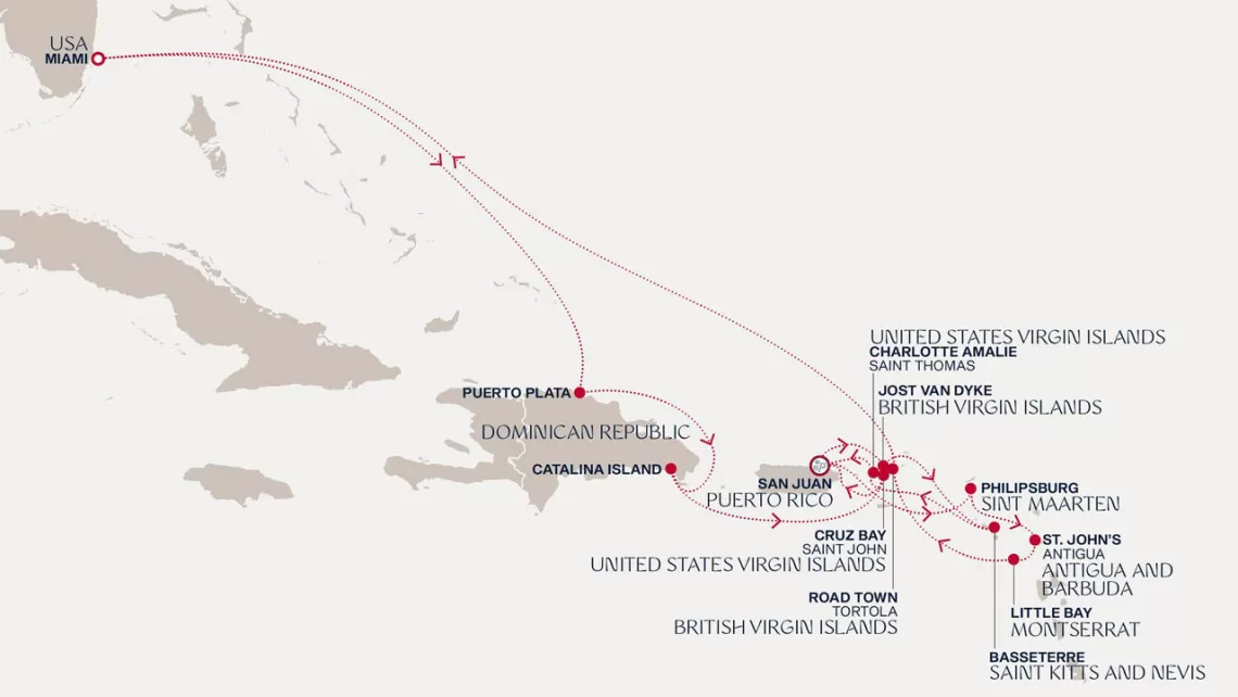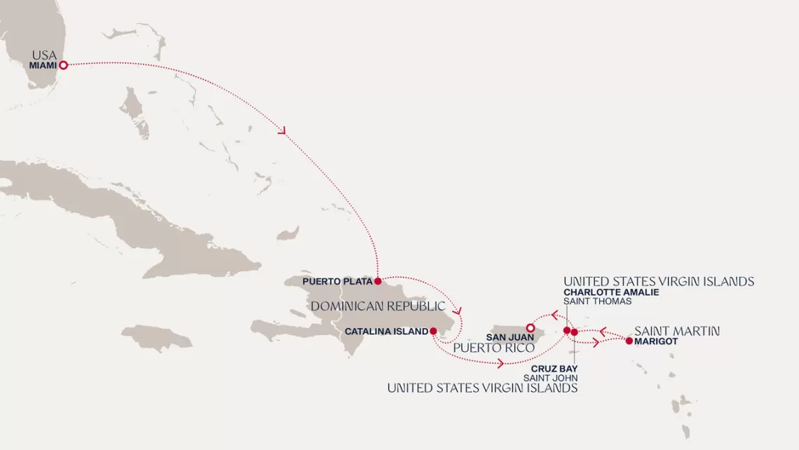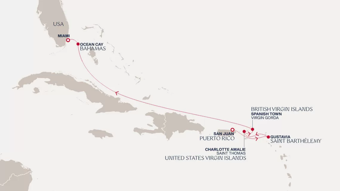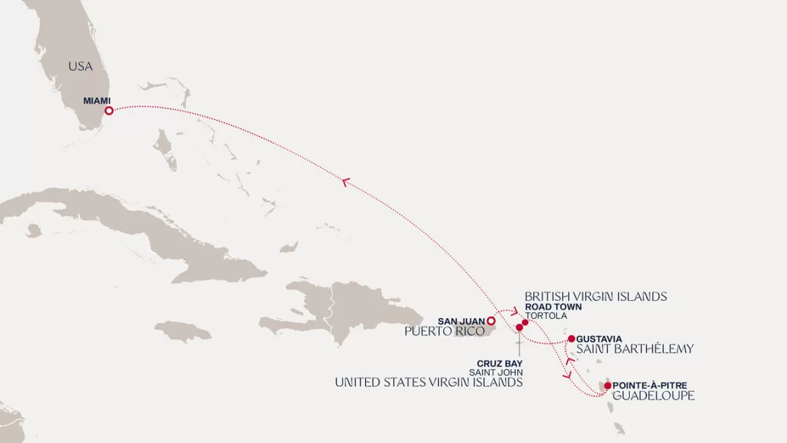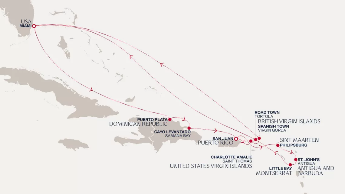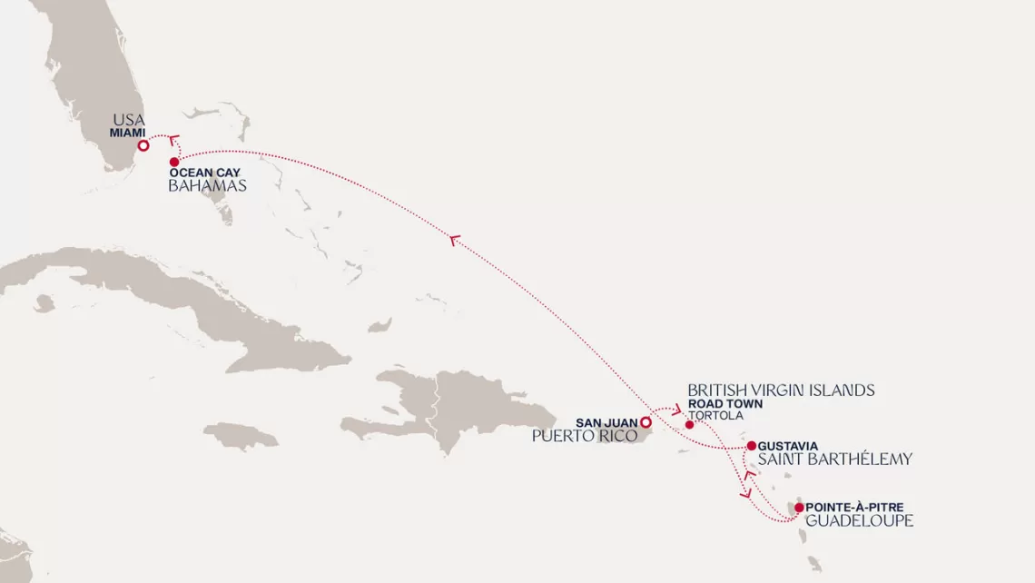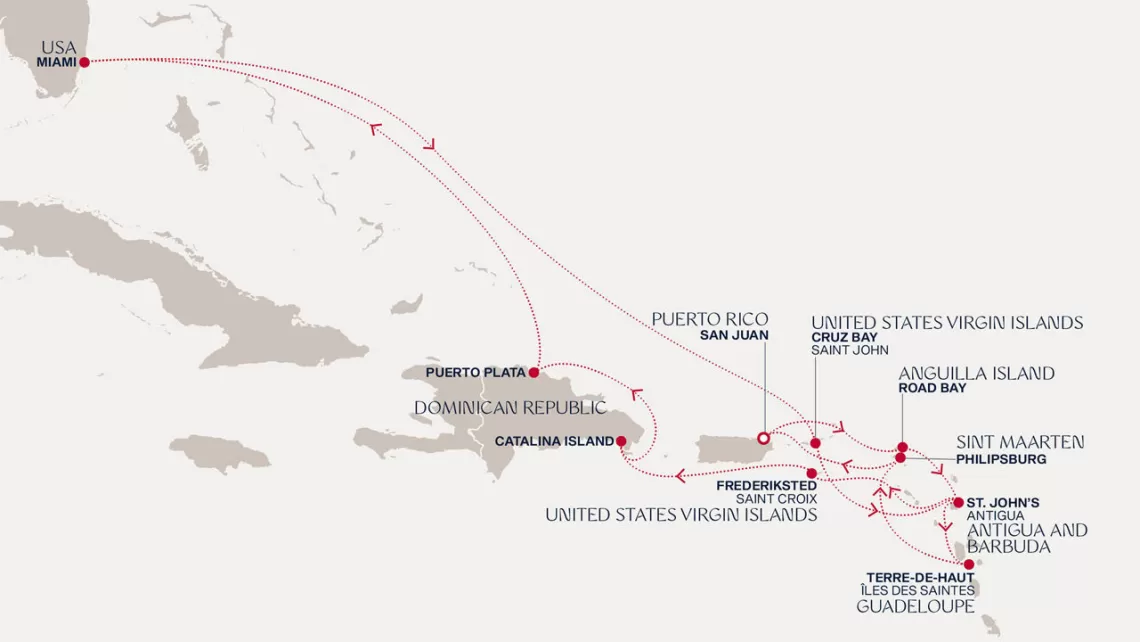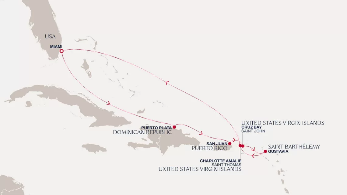 Маршрут круиза: Бриджтаун, о. Барбадос - Фор-де-Франс, о. Мартиника - Бастер, о. Сент-Китс - Сан-Хуан - Род-Таун, о. Тортола - Сент-Джонс, о.Антигуа - Густавия, о. Сен-Бартельми - Роуд Бэй, о. Ангилья - море - море - Майами - море - море - Ла-Романа - Сан-Хуан - Бастер, о. Сент-Китс - Ле Труа-Иле, о. Мартиника - о. Бекия - Кингстаун, о. Сент-Винсент - Бриджтаун, о. Барбадос