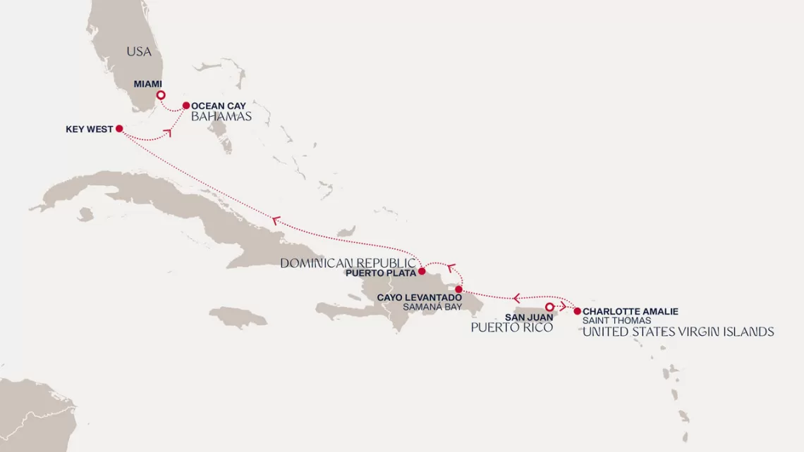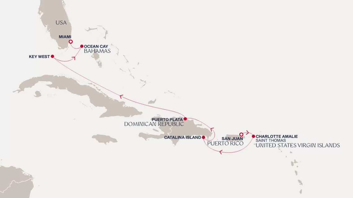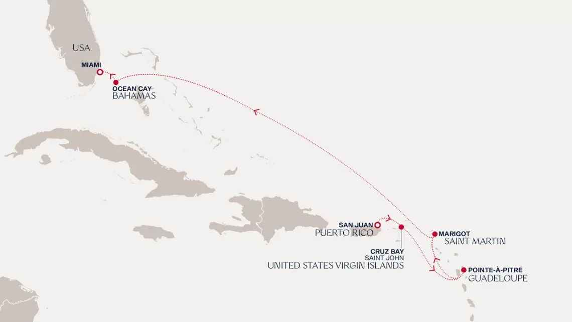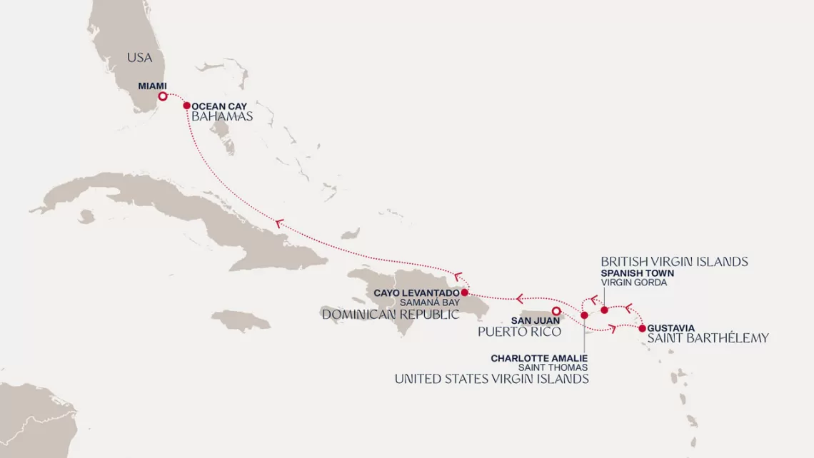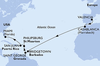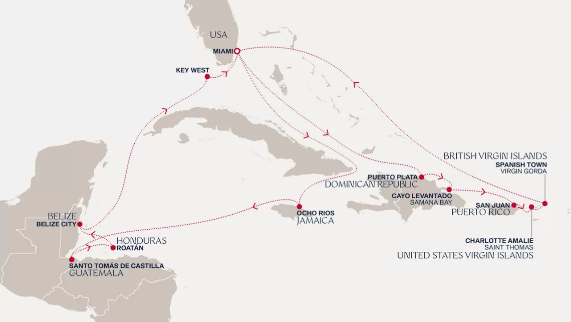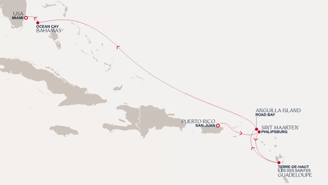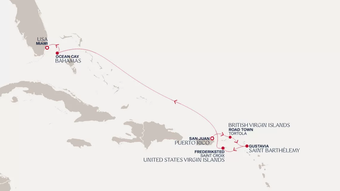 Маршрут круиза: Бриджтаун, о. Барбадос - Фор-де-Франс, о. Мартиника - Бастер, о. Сент-Китс - Сан-Хуан - Род-Таун, о. Тортола - Сент-Джонс, о.Антигуа - Густавия, о. Сен-Бартельми - Роуд Бэй, о. Ангилья - море - море - Майами - море - море - Ла-Романа - Сан-Хуан - Бастер, о. Сент-Китс - Ле Труа-Иле, о. Мартиника - о. Бекия - Кингстаун, о. Сент-Винсент - Бриджтаун, о. Барбадос
