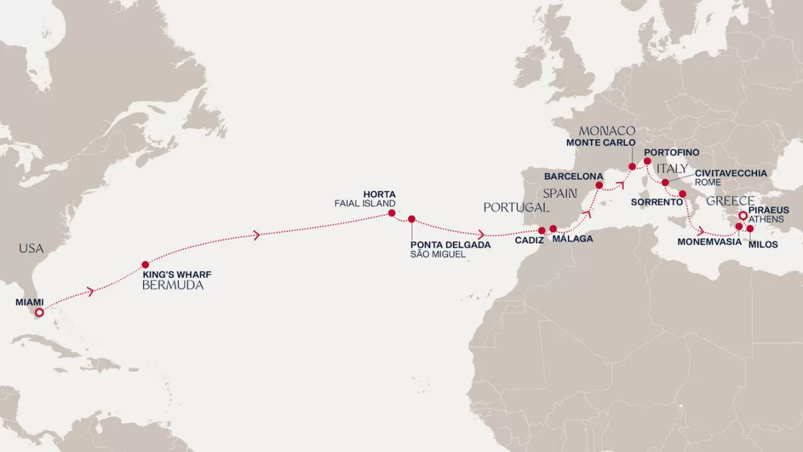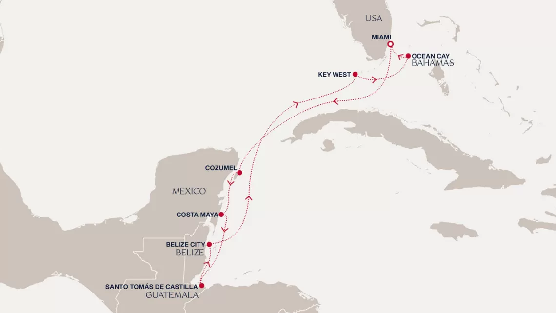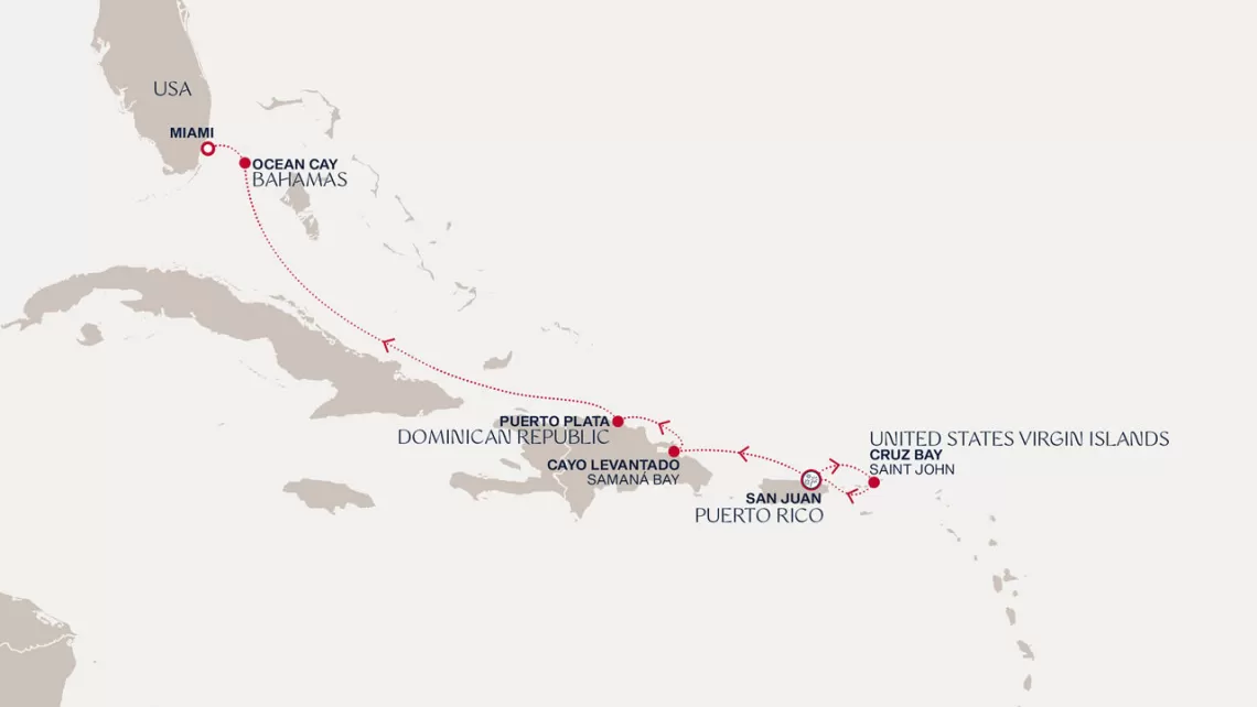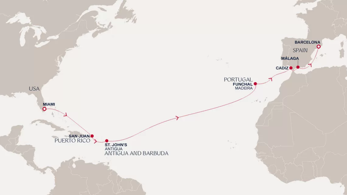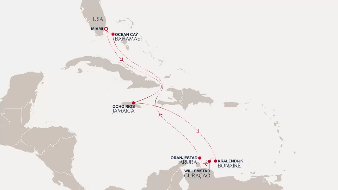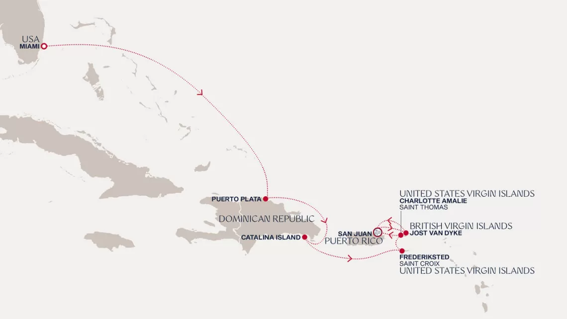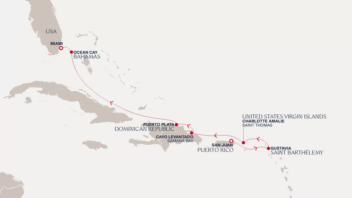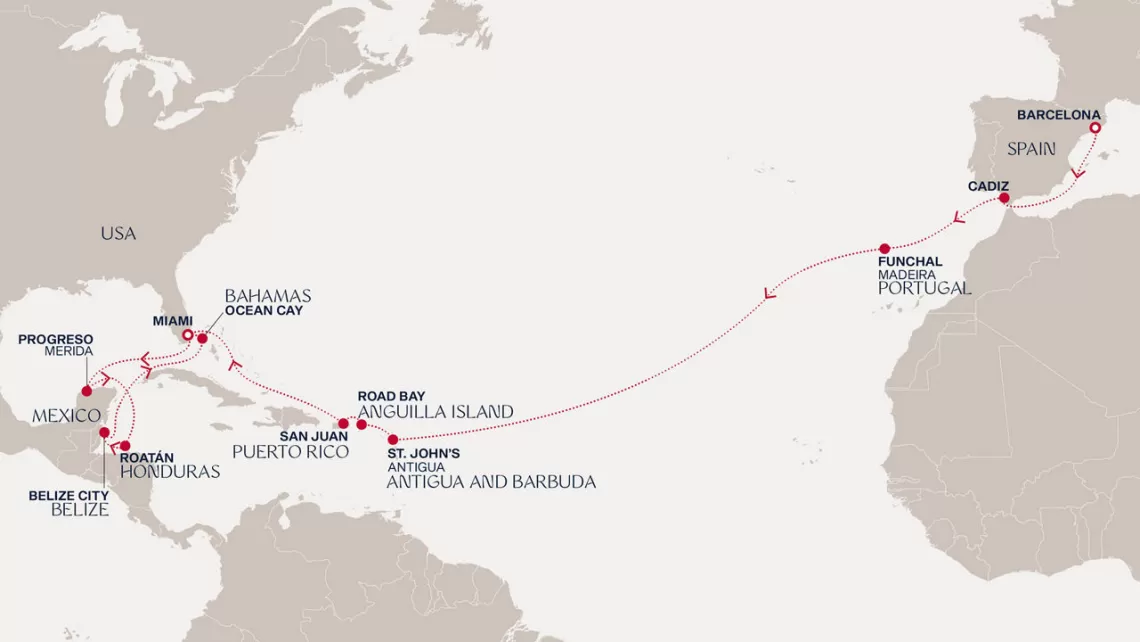 Маршрут круиза: Бриджтаун, о. Барбадос - Фор-де-Франс, о. Мартиника - Бастер, о. Сент-Китс - Сан-Хуан - Род-Таун, о. Тортола - Сент-Джонс, о.Антигуа - Густавия, о. Сен-Бартельми - Роуд Бэй, о. Ангилья - море - море - Майами - море - море - Ла-Романа - Сан-Хуан - Бастер, о. Сент-Китс - Ле Труа-Иле, о. Мартиника - о. Бекия - Кингстаун, о. Сент-Винсент - Бриджтаун, о. Барбадос