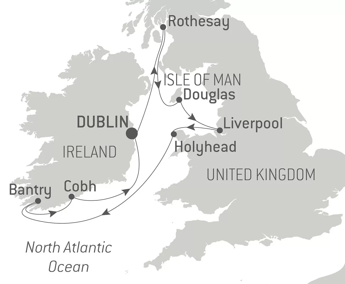 Маршрут круиза: Дублин - Ротсей - Дуглас, о. Мэн - Ливерпуль - Холихед - Бантри - Ков - Дублин