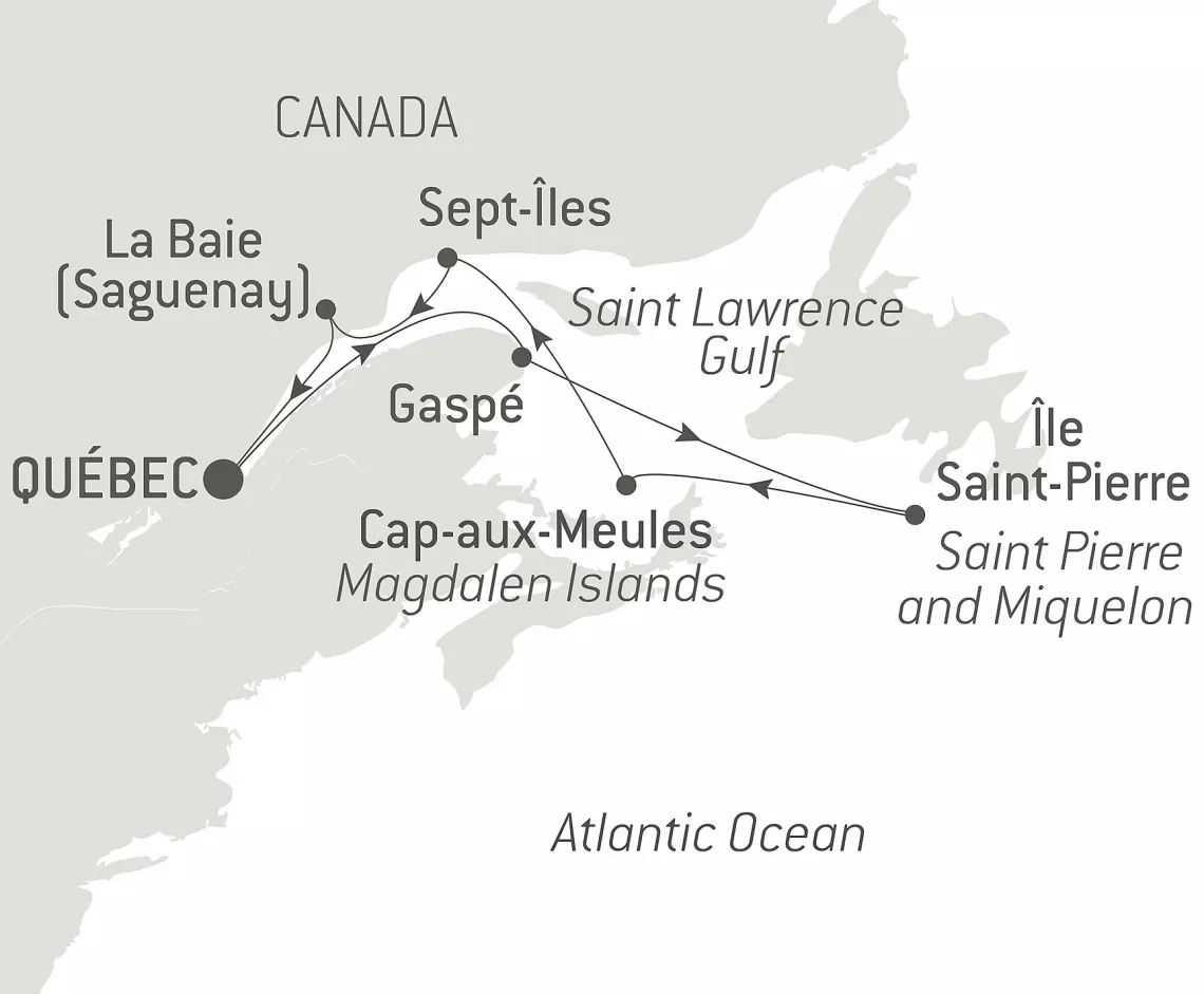 Маршрут круиза: Монреаль - Квебек - Ла-Бэ - Ла-Бэ - Гаспе - Гаспе - Залив Святого Лаврентия - Сен-Пьер, о. Сен-Пьер - Корнер-Брук - Залив Святого Лаврентия - пролив Белл-Айл - Залив Святого Лаврентия - Залив Святого Лаврентия - Сет-Иль - Сент-Лоуренс река - Монреаль