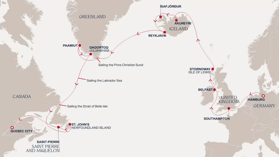 Маршрут круиза: Гамбург - море - Саутгемптон / Лондон - море - Белфаст - Сторновей - море - Акюрейри - Исафьордюр - Рейкьявик - Рейкьявик - море - пролив Принца Кристиана - Паамиут - Какорток - море - море - Сент-Джонс - Сен-Пьер, о. Сен-Пьер - море - Квебек - Квебек
