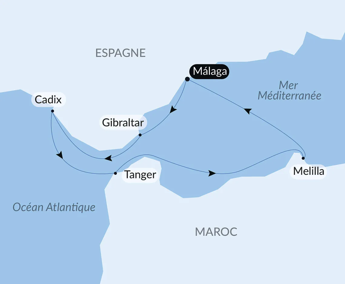 Маршрут круиза: Лиссабон - Лиссабон - Портиман - Кадиc / Севилья - Марбелья - Малага - Танжер - Касабланка - море - Фуншал, о. Мадейра - Фуншал, о. Мадейра - Санта-Крус-де-ла-Пальма, о. Ла-Пальма - Санта-Крус-де-Тенерифе, о. Тенерифе - Лас-Пальмас, о. Гран-Канария