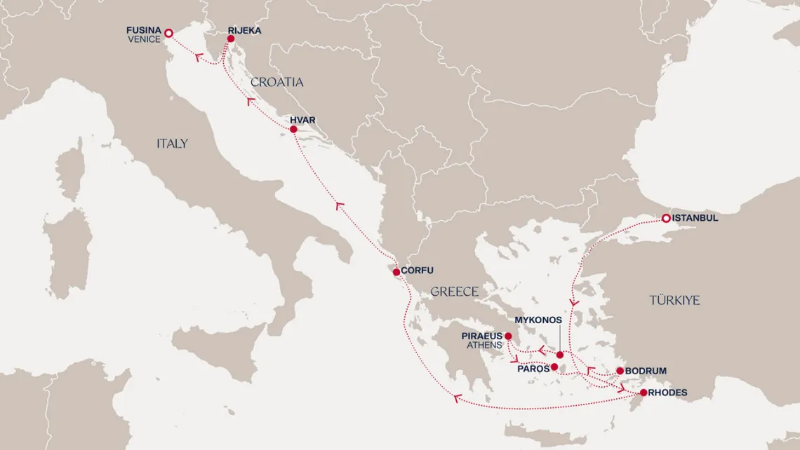 Маршрут круиза: Стамбул - Стамбул - Бодрум - о. Патмос - Пирей / Афины - о. Парос - о. Родос - море - о. Корфу - Хвар - Риека - Венеция