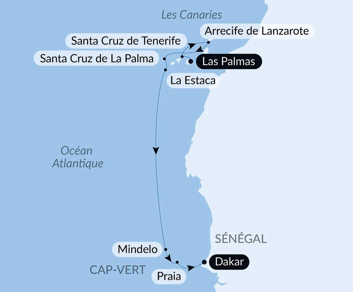 Маршрут круиза: Лас-Пальмас, о. Гран-Канария - Аресифи, о. Лансароте - Пуэрто-дель-Росарио, о. Фуэртевентура - Санта-Крус-де-Тенерифе, о. Тенерифе - Сан-Себастьян-де-ла-Гомера - море - море - Минделу, о. Сан-Висенте - Прая - море - Дакар