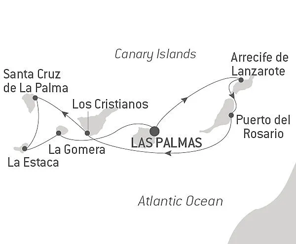 Маршрут круиза: Лас-Пальмас, о. Гран-Канария - Аресифи, о. Лансароте - Пуэрто-дель-Росарио, о. Фуэртевентура - Санта-Крус-де-Тенерифе, о. Тенерифе - Санта-Крус-де-ла-Пальма, о. Ла-Пальма - Пуэрто де ла Эстака, о. Иерро - Сан-Себастьян-де-ла-Гомера - Лас-Пальмас, о. Гран-Канария