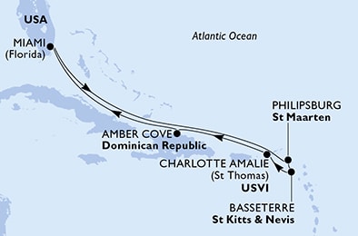 Маршрут круиза: Майами - о. Оушен Кей - море - море - Филипсбург, о. Синт-Мартен - Бастер, о. Сент-Китс - Шарлотта-Амалия, о. Сент-Томас - Амбер Коув - море - Майами