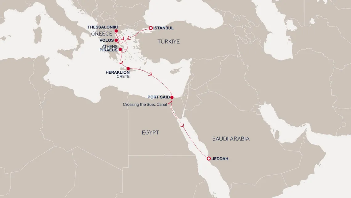 Маршрут круиза: Барселона - море - море - Санта-Крус-де-Тенерифе, о. Тенерифе - море - море - море - море - море - море - о. Гранд-Терк - море - о. Оушен Кей - море - Косумель - море - Лимон - Панамский канал - Панамский канал - море - Манта - море - Кальяо / Лима - Кальяо / Лима - море - Арика - море - море - море - море - море - Ханга-Роа, о. Пасхи - море - море - Баунти-Бэй - море - море - Папеэте, о.Таити - Папеэте, о.Таити - море - море - море - море - Нукуалофа, о. Тонгатапу - море - море - Нумеа - море - море - Окленд - Тауранга - Нейпир - Пиктон - Веллингтон - море - море - море - Сидней - Сидней - море - море - море - море - Кэрнс - Кэрнс - Кэрнс - Кэрнс - Кэрнс - Кэрнс - море - море - море - море - о. Ломбок - Беноа, о. Бали - море - море - море - Хошимин - море - море - Халонг Бэй / Ханой - Халонг Бэй / Ханой - Чан Мэй - море - море - Лаем Чабанг / Бангкок - море - Сиануквиль - море - море - Сингапур - Порт-Кланг - море - море - море - Коломбо - Кочин - море - Мумбаи (быв. Бомбей) - Мумбаи (быв. Бомбей) - море - море - море - Дубай - Дубай - Маскат - море - море - море - море - море - Акаба - Суэцкий Канал - Суэцкий Канал - Александрия - море - море - Чивитавеккья / Рим - Генуя / Милан - Марсель - Барселона