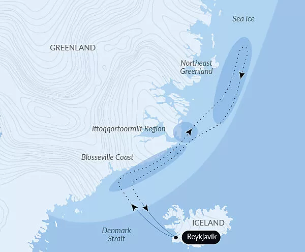 Маршрут круиза: Рейкьявик - море - побережье Блосвиль - Иллоккортоормиут - Иллоккортоормиут - Иллоккортоормиут - Иллоккортоормиут - Исследование Северо-восточной Гренландии - Исследование Северо-восточной Гренландии - море - побережье Блосвиль - побережье Блосвиль - побережье Блосвиль - море - Рейкьявик
