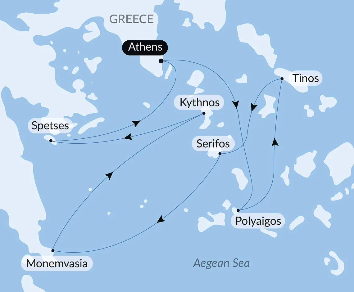Маршрут круиза: Лаврион / Афины - о. Тинос - остров Полиэгос - Ливадион - Монемвасия - Меричас - о. Спеце - Лаврион / Афины