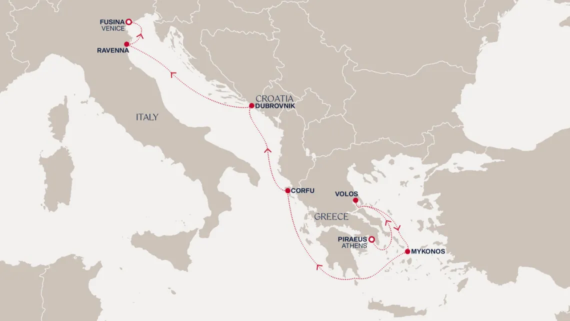 Маршрут круиза: Пирей / Афины - о. Милос - Ираклион, о.Крит - море - Джардини-Наксос, о. Сицилия - Валлетта - Ла-Гулетт - море - о. Ибица - Барселона - море - Кадиc / Севилья - Гибралтар - Мотриль - Картахена - море - Сен-Тропе - Монте-Карло - Ливорно / Флоренция, Пиза - Чивитавеккья / Рим