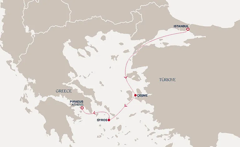 Маршрут круиза: Стамбул - море - о. Корфу - Бари - Триест - море - Катаколон / Олимпия - Пирей / Афины - Измир / Эфес - Стамбул