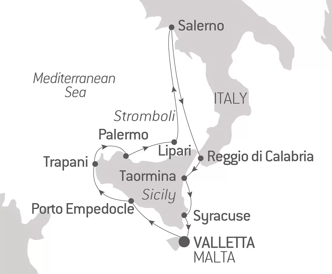 Маршрут круиза: Валлетта - Порт Эмпедокле, о. Сицилия - Трапани, о. Сицилия - Палермо, о. Сицилия - о. Липари - о. Стромболи - Салерно - Реджо-ди-Калабрия - Таормина, о. Сицилия - Сиракузы, о. Сицилия - Валлетта