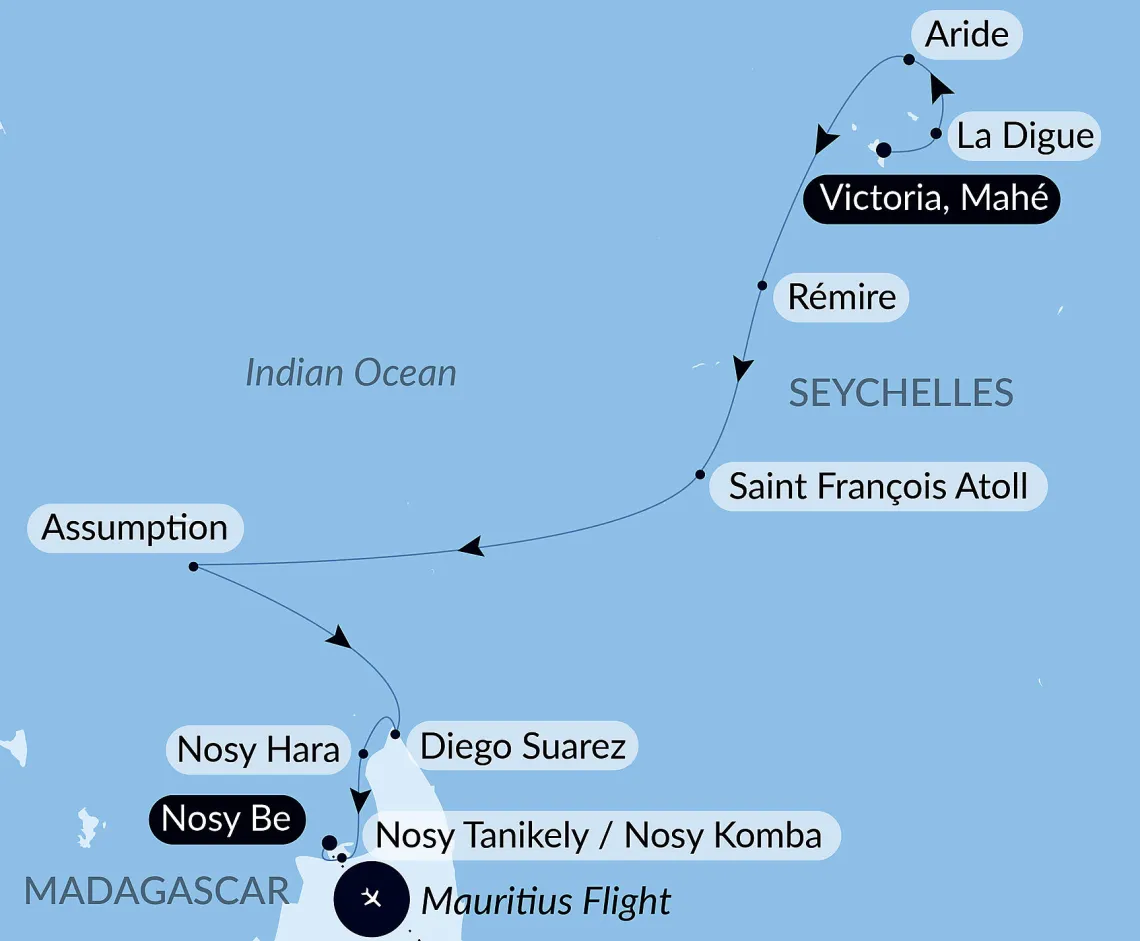 Маршрут круиза: Виктория, о. Маэ - о. Ла-Диг - о. Арид - о. Кюрьёз - остров Ремир - остров Сен-Франсуа - о. Фаркуар - Анциранана - Анциранана - о. Нуси-Хара - о. Нуси-Комба - о. Нуси-Таникели - о. Нуси-Бе