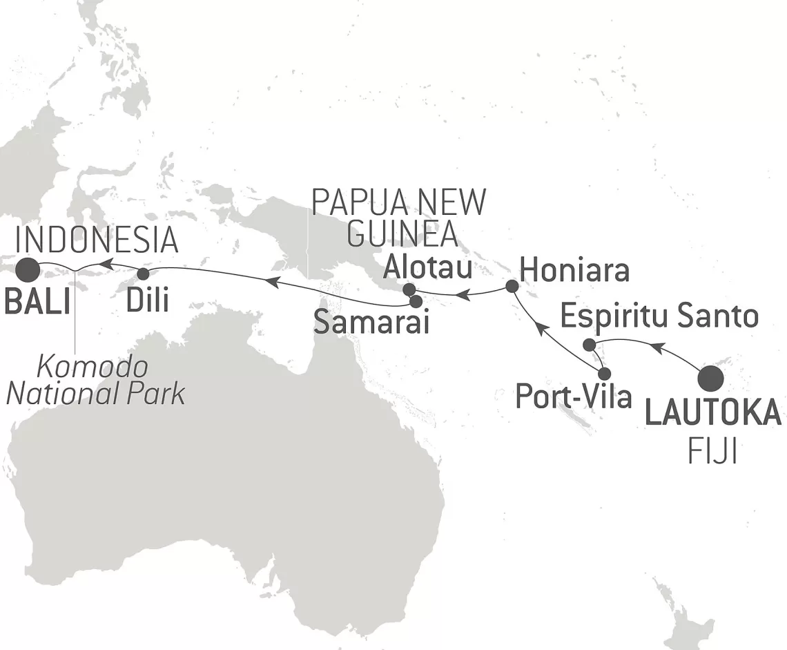 Маршрут круиза: Лаутока, о. Вити-Леву - море - море - о. Эспириту-Санто - Порт-Вила - море - море - Хониара - море - Алотау - о. Самарай - море - море - море - море - Дили, о. Тимор - море - о. Комодо - Беноа, о. Бали - Беноа, о. Бали