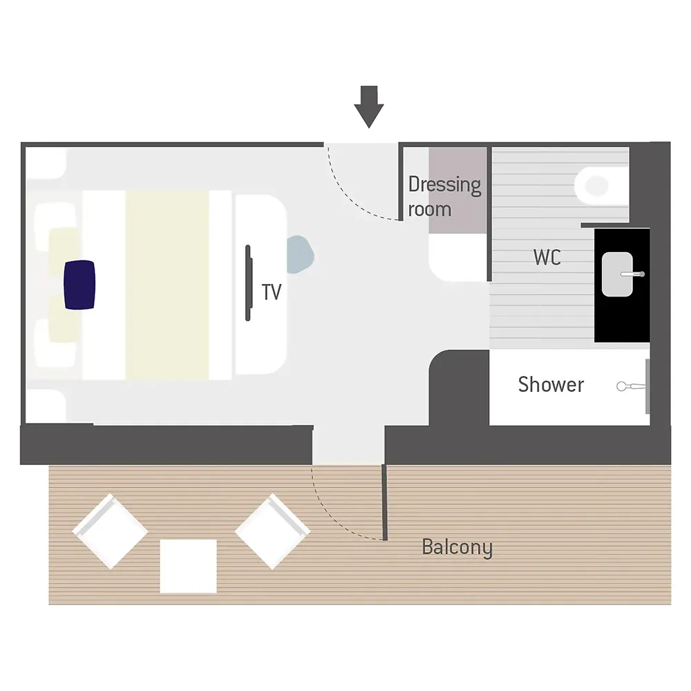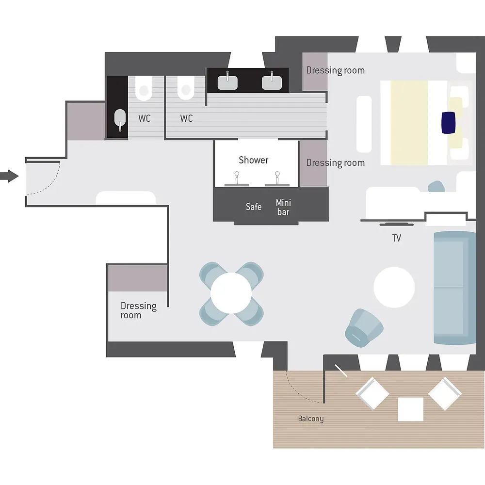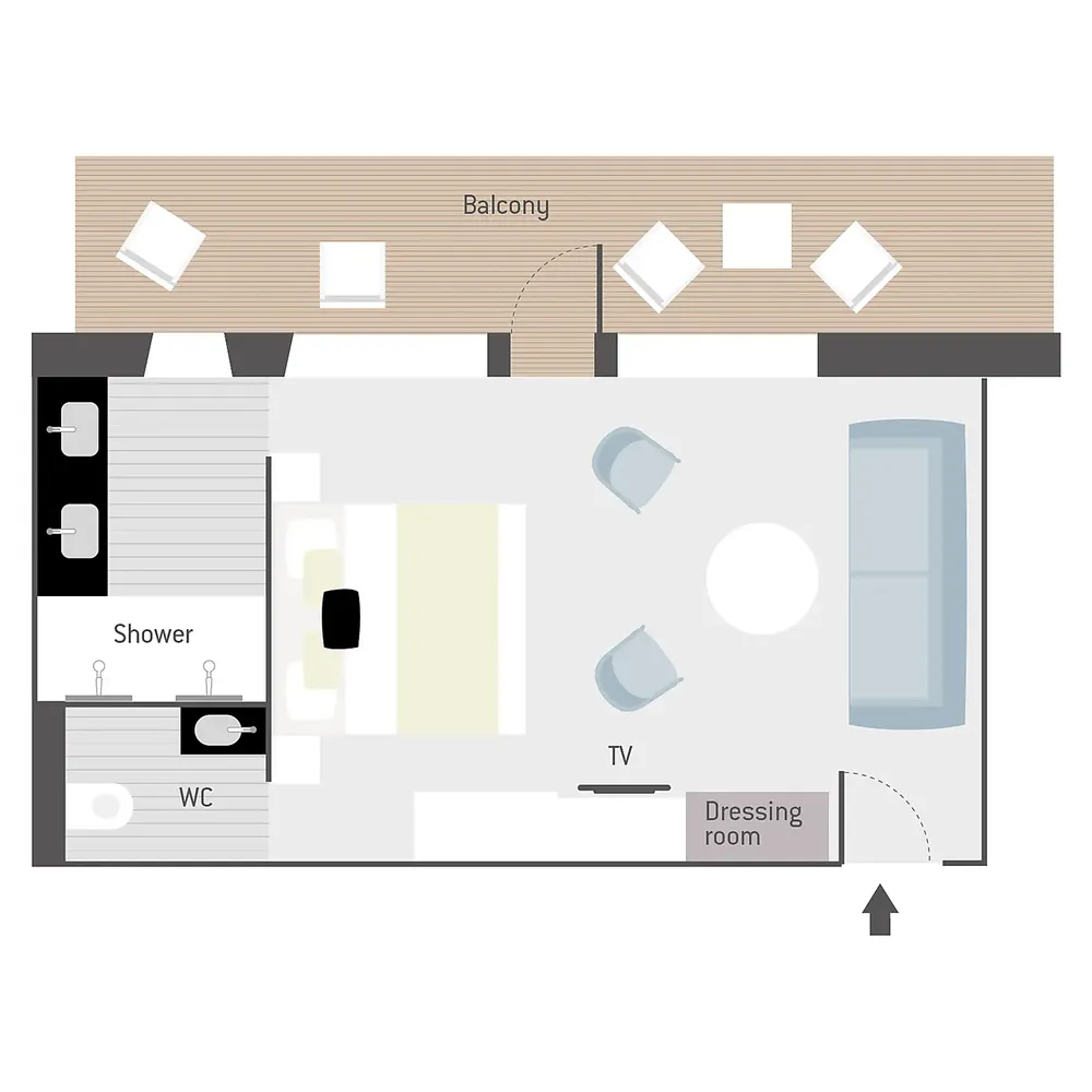 • Собственный балкон площадью 9 м² с четырьмя креслами