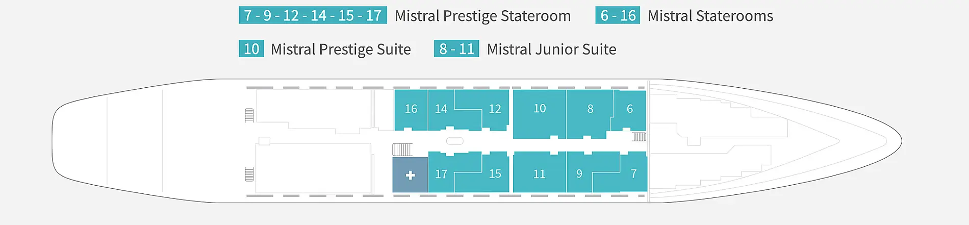 Расположение каюты можно посмотреть на плане палуб во вкладке "Круизный лайнер" на странице выше. Первые цифры номера каюты - номер палубы. Каюты отмеченные "для инвалидов" могут быть заменены MSC на каюту той же категории с другим расположением на лайнере без согласования с Клиентом.