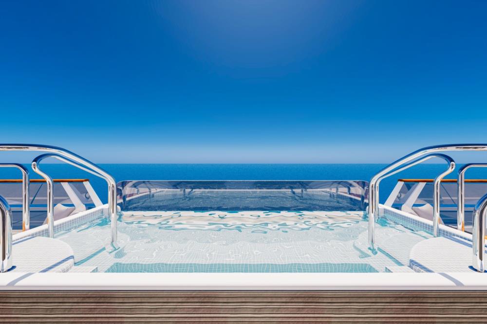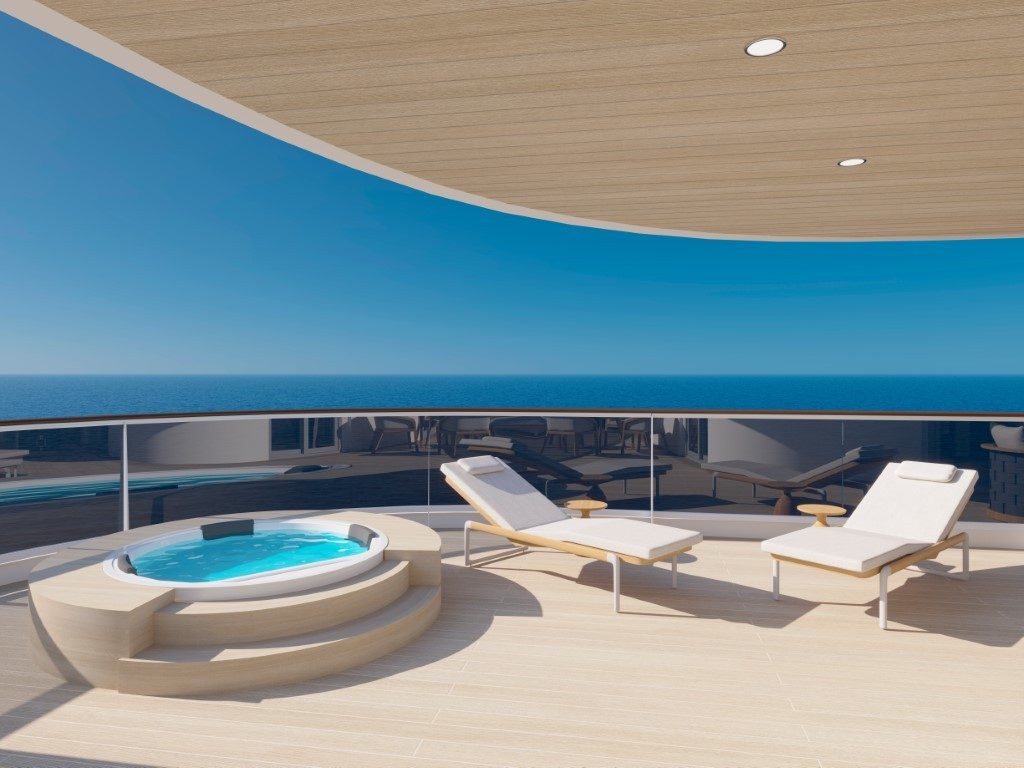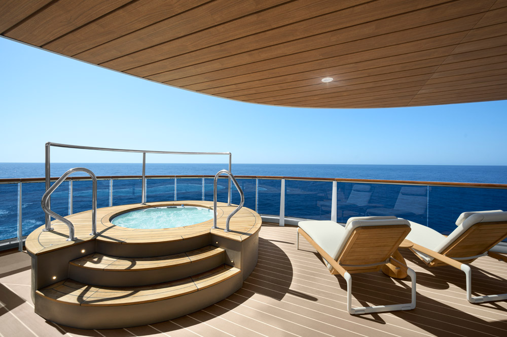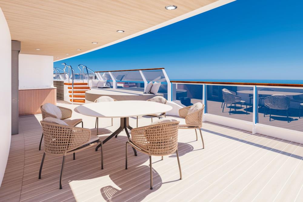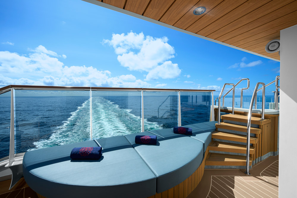 • просторная панорамная терраса во всю ширину лайнера, обеденная и лаундж-зоны, джакузи и шезлонги, душ.
