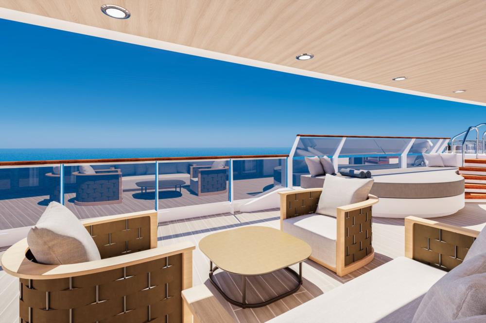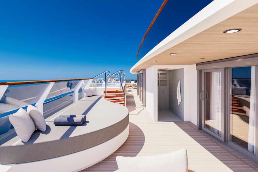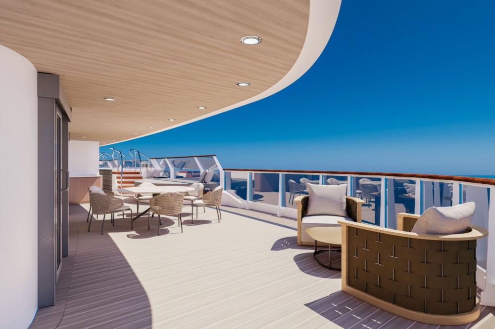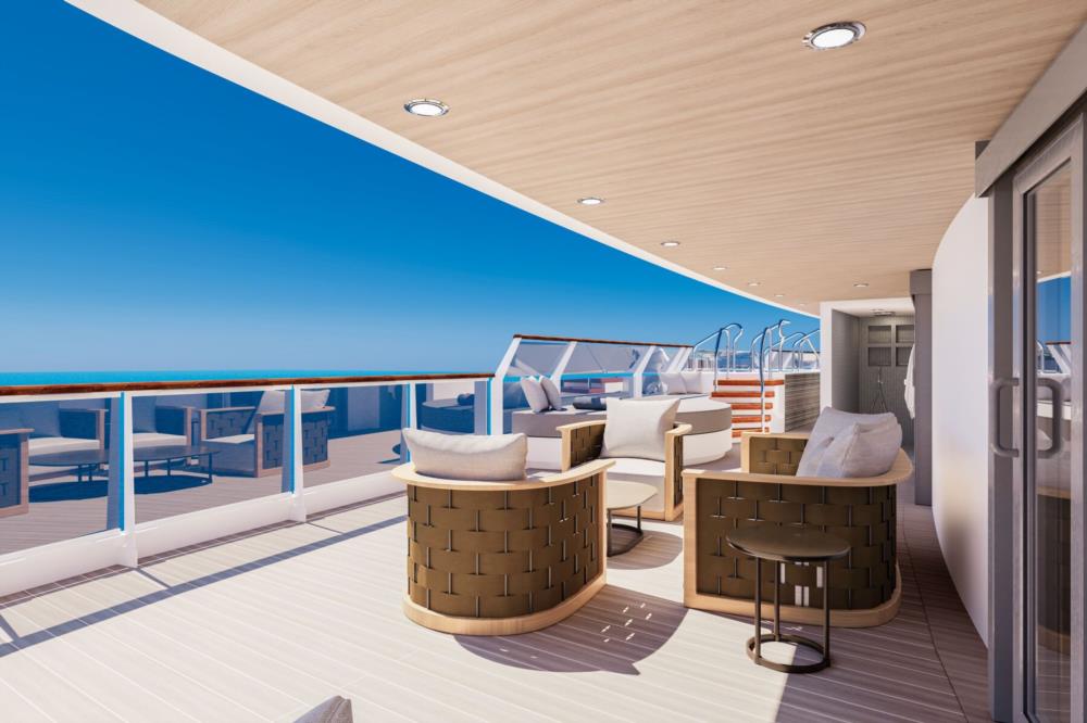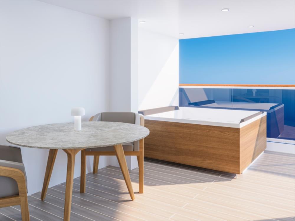 • просторная панорамная терраса во всю ширину лайнера, обеденная и лаундж-зоны, джакузи и шезлонги, душ.