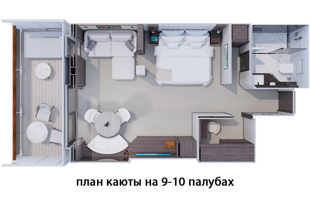 Площадь каюты: ~ 74 м2 (балкона ~ 75 м2)