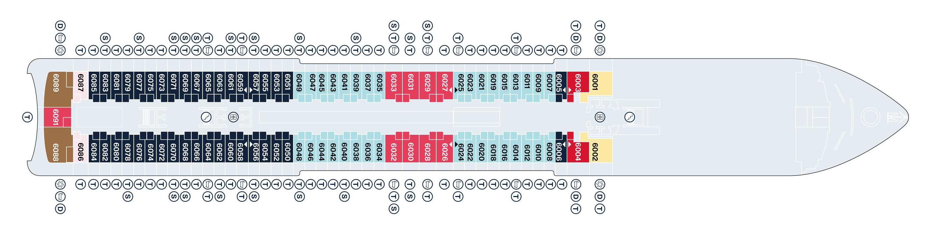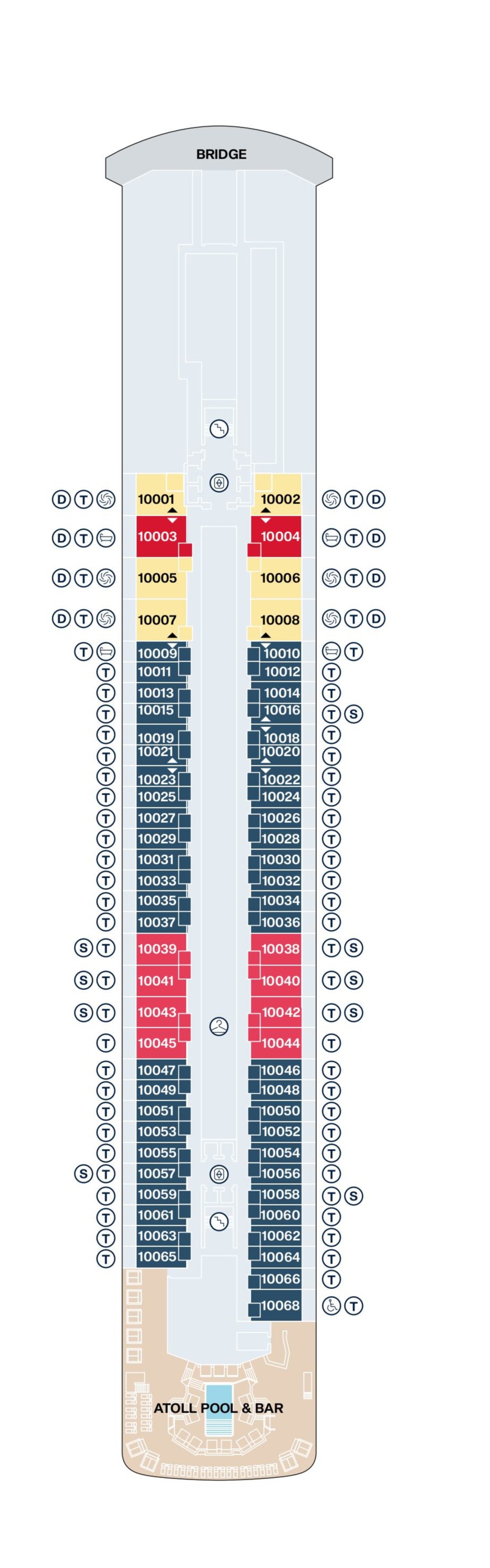 Расположение каюты можно посмотреть на плане палуб во вкладке "Круизный лайнер" на странице выше. Первые цифры номера каюты - номер палубы. Каюты отмеченные "для инвалидов" могут быть заменены MSC на каюту той же категории с другим расположением на лайнере без согласования с Клиентом.