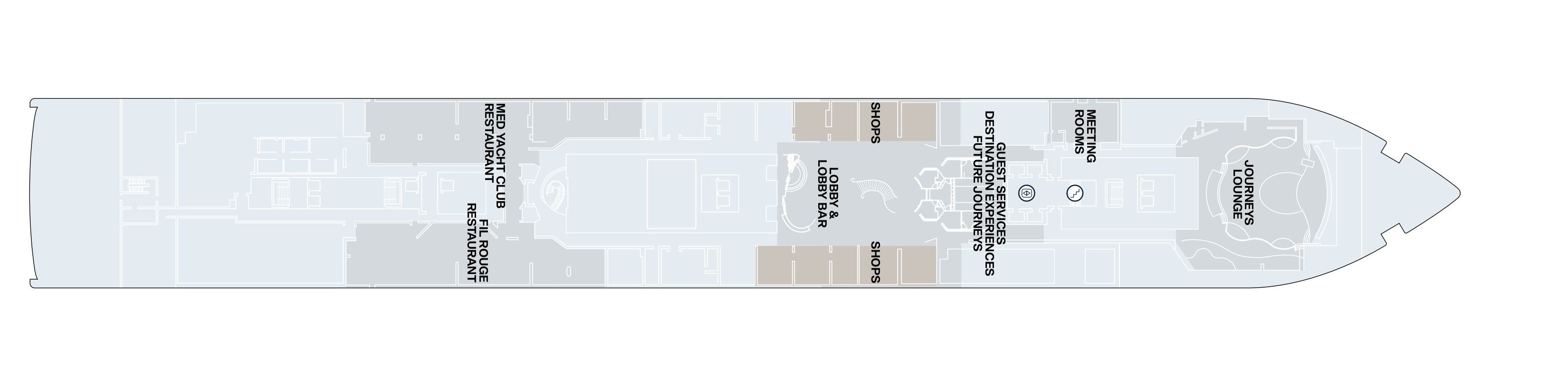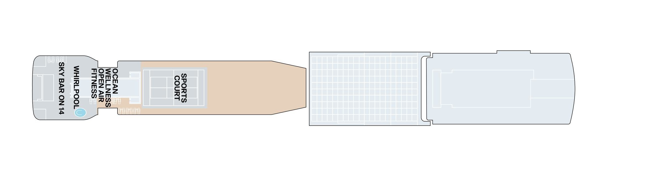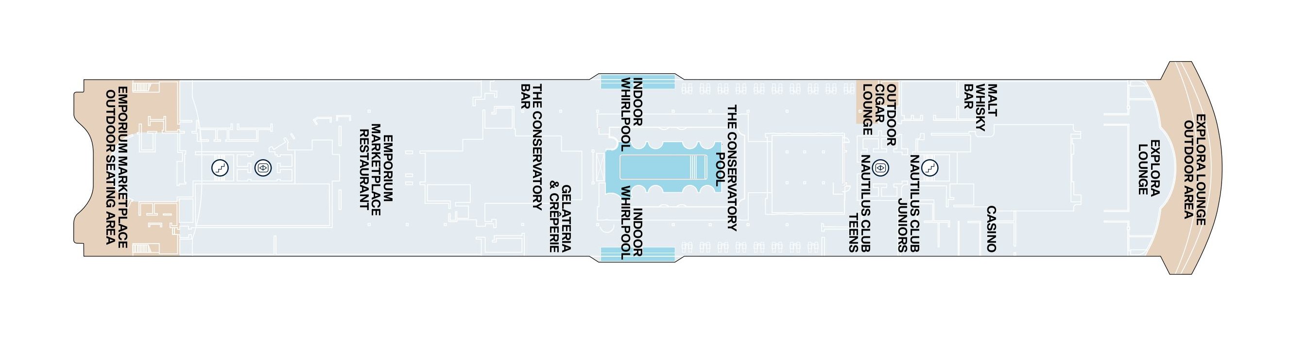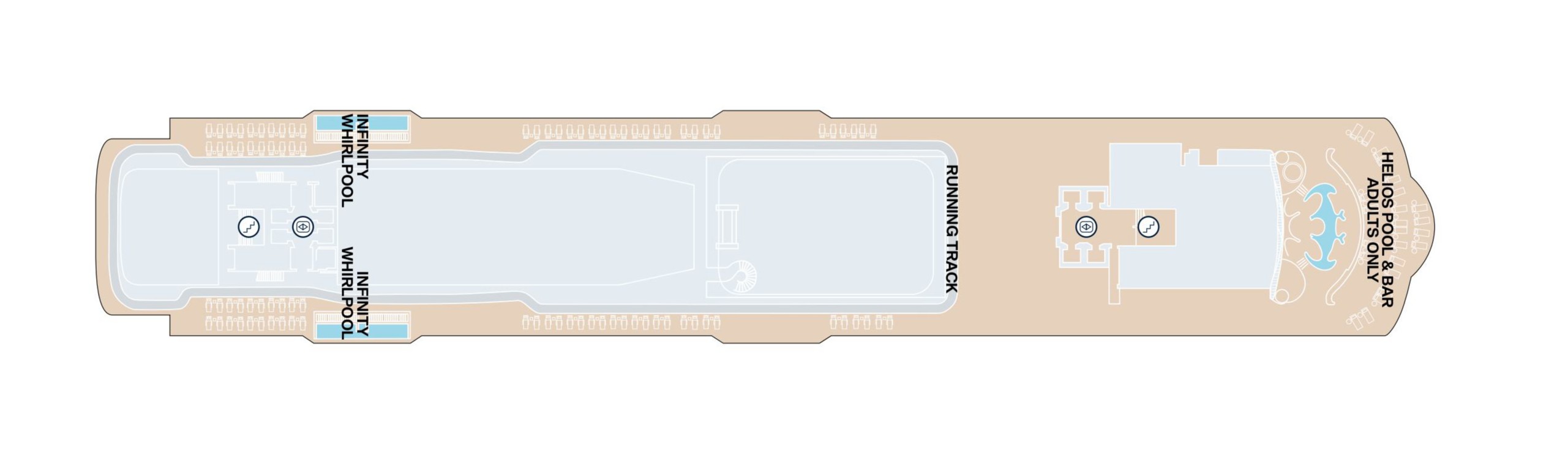 • просторная панорамная терраса во всю ширину лайнера, обеденная и лаундж-зоны, джакузи и шезлонги, душ.